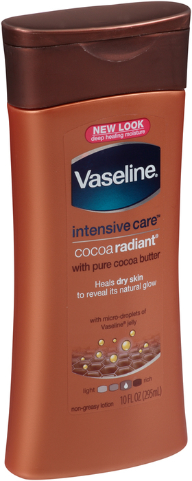 Vaseline intensive care hand and body lotion cocoa radiant 10 fl. Vaseline® intensive care™ cocoa radiant body lotion moisturizes dry skin. Made with cocoa butter and a blend of vaseline jelly, vaseline intensive care cocoa radiant body lotion helps keep your skin looking healthy and fresh. Our rich formula combines 100% pure cocoa and shea butters, giving you a natural glow. Vaseline intense care cocoa radiant body lotion is a great product.